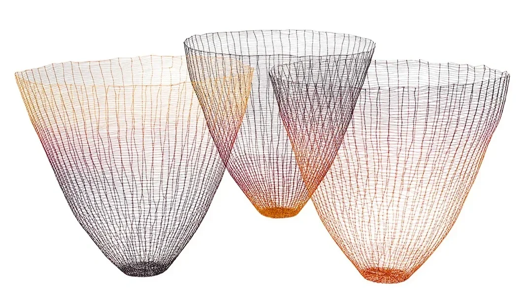 W wielu pracach proces pozostaje widoczny: ślad ognia, napięcie formy, deformacja, ciężar. Obiekty balansują na granicy kontroli i przypadku — szkło przypomina erodującą powierzchnię, porcelana osad geologiczny, a plecionki przybierają niemal architektoniczną skalę. Projekt nie kończy się na estetyce — staje się badaniem właściwości materii.