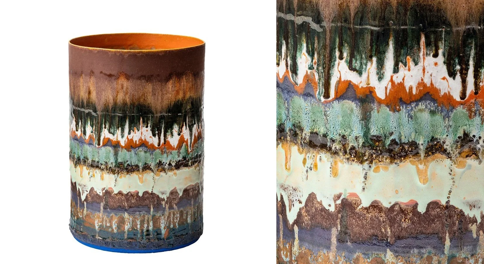 „#2572” - cylindryczne naczynie wytoczone na kole garncarskim i trzykrotnie szkliwione autorstwa Mortena Løbner Espersena.
